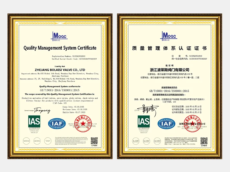 Zhejiang Bolaisi Valve Co., Ltd. est engagée dans l'industrie des vannes depuis plus de 20 ans. La société a été officiellement enregistrée et créée en 2013. Après plus de dix ans de développement, les exigences commerciales de Bolaisi Valve n'ont cessé d'augmenter. Pour répondre à ces demandes croissantes, l'entreprise a créé une société de commerce d'importation et d'exportation en 2025. Les principaux produits de l'entreprise comprennentvanne à vannes, vannes à soupape, clapets anti-retour, robinets à tournant sphérique, vannes papillon, et des filtres. Tout au long de son développement, l’entreprise a reçu un fort soutien de la part de tous les secteurs de la société et de ses clients. Face aux défis futurs, l'entreprise adoptera une toute nouvelle philosophie d'entreprise, cultivera soigneusement une culture d'entreprise unique et se consacrera à fournir aux clients nationaux et internationaux des solutions plus pratiques, une meilleure réputation, des produits de meilleure qualité et des services plus complets. Nous adhérons toujours aux principes commerciaux de « poursuite de l'excellence sans limites » et de « tout pour le client ». Nous invitons sincèrement les nouveaux et anciens clients du pays et de l'étranger à visiter notre entreprise pour obtenir des conseils et une coopération basés sur les principes de « haute qualité et prix raisonnable, avantages complémentaires et bénéfice mutuel ». Bolaisi Valve est prêt à travailler main dans la main avec vous, à grandir ensemble et à créer un avenir brillant !